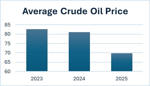 Global crude oil prices fell sharply in 2025 driven by economic and geopolitical factors that affected demand and supply dynamics in the international market. As a result, average crude oil prices declined by about 14% in 2025 from an average of USD81.03/bbl in 2024 to an average of USD69.70/bbl in 2025.