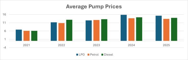 Pump prices of diesel also declined by an average of about 2.41% in 2025. Compared to the same period last year, pump prices of diesel are down by 21.63%. Diesel is currently being sold below GHS12 per liter among some OMCs.