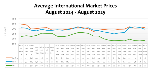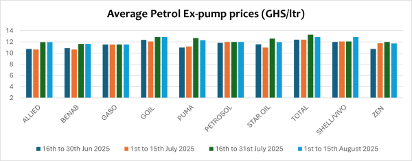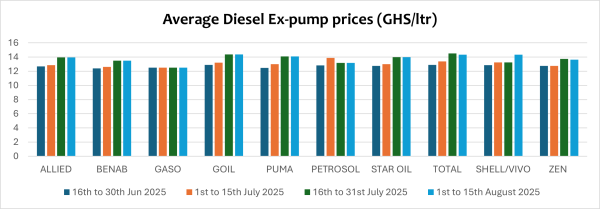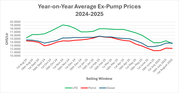 Total taxes, levies, and regulatory margins within the 1st to 15th August 2025 selling window increased from 28.36%, 24.92%, and 15.23% of the ex-pump prices of petrol, diesel, and LPG, respectively, to 34.81% and 31.00% for petrol and diesel, respectively, due to the implementation of the GHS1/Ltr levy.